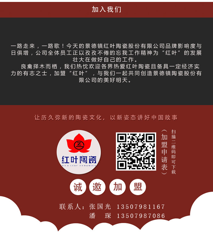 良禽擇木而棲,我們熱忱歡迎各界熱愛紅葉陶瓷且備具一定經濟實力的有志之士,加盟“紅葉”,與我們一起共同創(chuàng)造景德鎮(zhèn)紅葉陶瓷股份有限公司的美好明天。