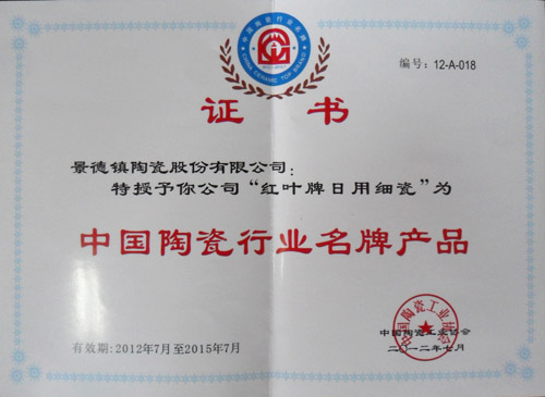 中國陶瓷工業(yè)協(xié)會于今年2月份開展了第五批中國陶瓷行業(yè)名牌產(chǎn)品的推薦評審及復(fù)評工作。經(jīng)過企業(yè)自愿申請、資料審查、專家評審、組委會領(lǐng)導(dǎo)小組審查、公示等一系列細(xì)致的工作,最終評選出了2012年“中國陶瓷行業(yè)名牌產(chǎn)品”。公司生產(chǎn)的“紅葉”牌日用陶瓷再次被評為“中國陶瓷行業(yè)名牌產(chǎn)品”。